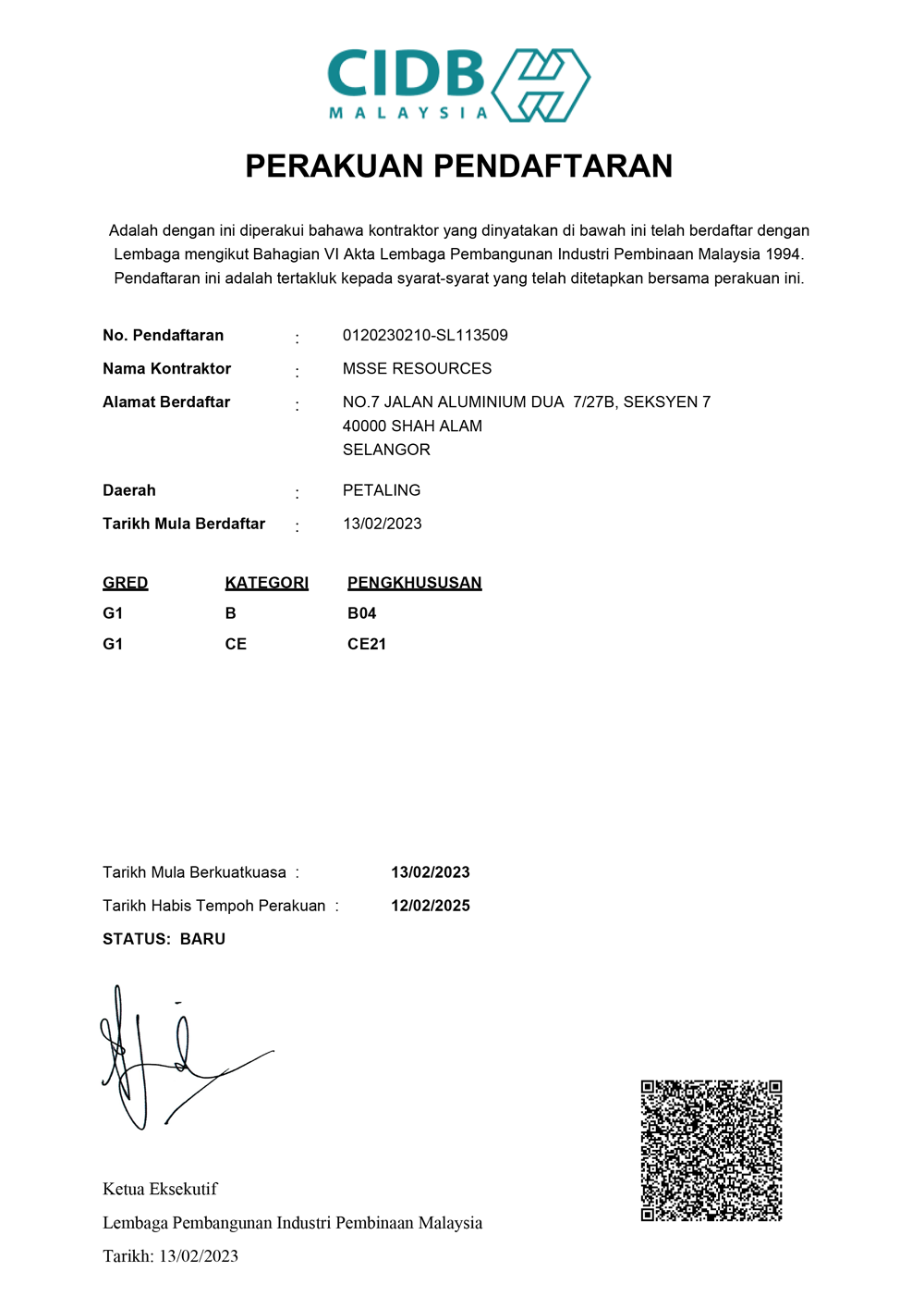 We are CIDB certified. All contractors are required to be registered with CIDB before carrying out any work subject to CIDB Act 520.